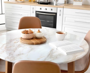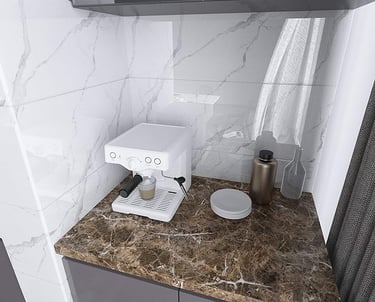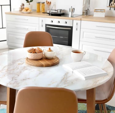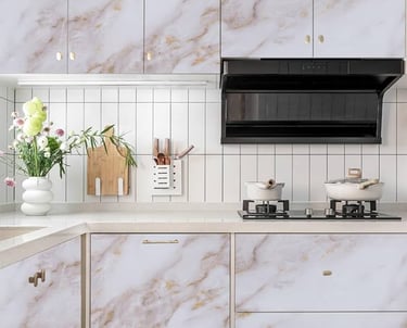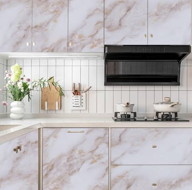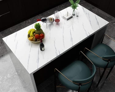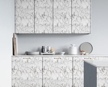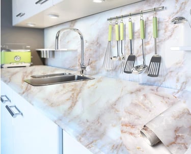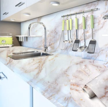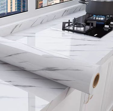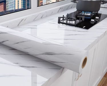 Renueva tus espacios con nuestros vinilos tipo mármol, ideales para topes de cocina y superficies que necesitan elegancia, resistencia y fácil mantenimiento. Su acabado premium imita el mármol real, es *resistente a altas temperaturas, soporta el uso diario y se limpia en segundos con solo pasar un paño.